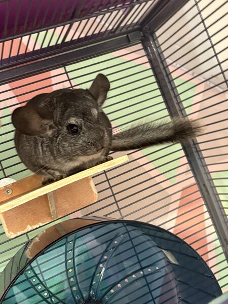 Chinchilla (female) with all you need for her. Critter nation cage, wheels, dust and bath house, food and more.