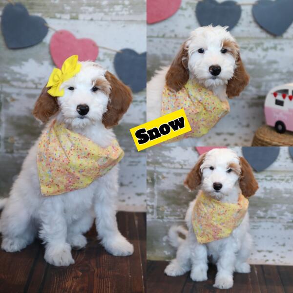 message dollysdoodles about this ad Born Nov 12th. Mom is 37lbs and dad is 30lbs. Snow is a female .Nice silky coat. Dad is genetically plus/minus for curl so they should have nice soft lower maintenance wavy coats as adults. we just did a price reduction. Ready now. |