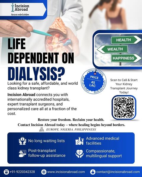 message incisionabroad1 about this ad A kidney transplant offers renewed health and freedom from dialysis for patients with end-stage kidney disease. Incision Abroad connects you to accredited hospitals and top transplant surgeons across trusted destinations including Turkey, India, Thailand, and the UAE. Our Support Expert Guidance: Pre-transplant evaluation and donor matching. Global Network: World-class hospitals with high success rates. Complete Care: Travel, visa, and hospital coordination plus 247 assistance. Recovery Follow-up: Ongoing monitoring for long-term health. Conditions treated include chronic kidney disease, ESRD, and polycystic kidney disease. Choose Incision Abroad for transparent costs, personalized attention, and a safe path to a healthier future. For more click here kidney transplant! |