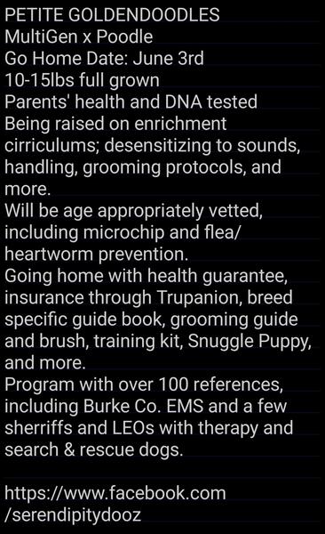 message sccompanions about this ad These beautiful babies already have a waiting list! The best way to contact Southern Charm Companions is either on our Facebook page shown in the screenshot, or by phone (828) 43O O6OO. facebook.com/serendipitydooz southerncharmcompanionsnc.com |