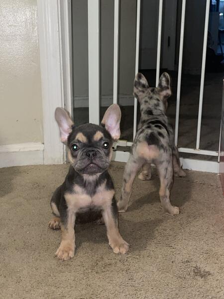 1 Tri french bulldogs. 5 months old female. Mom blue & tan lilac Tri & Dad Merle.