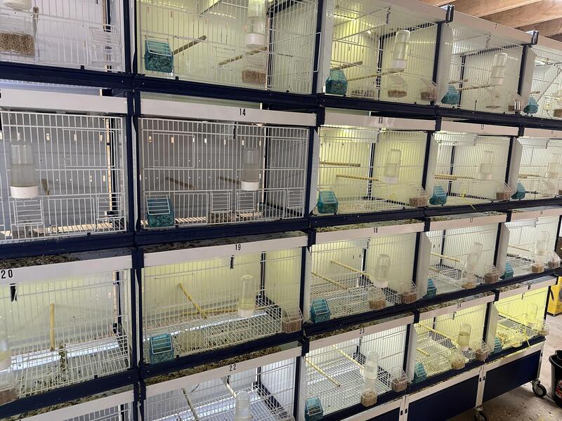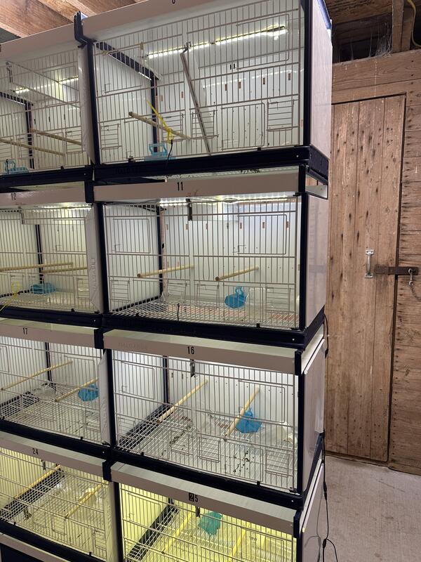 message birdoc about this ad European modular cage bank. This set hold 25 pairs of Finches, canaries, Lovebirds, Parrotlets. It has LED lights, paper rolls for easy cleaning, wheels for easy movement. It breaks down into individual single cages, has dividers for each cage, spring loaded doors, is 5 cages long by 5 cages high. Manufactured in The Netherlands- it is a time saver, comes with perches, food dishes, and water bottles. Too big to ship, must be picked up in Okla City. Was $5000 new, and is metal and like new now. $2000 . Will drive a short distance to meet(200 miles |