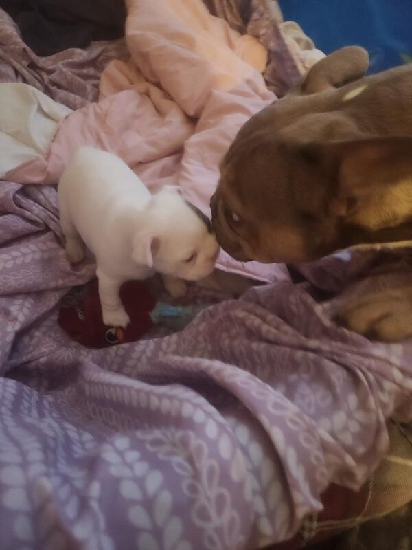 message penno1ma about this ad Ruby and Blue currently have two puppies available, just in time for Christmas! One male(Brindle and White one female(all white with Blue brindle spot Family home, vet checked, will have first shots and be dewormed. Asking $1,000. Mom is Black/Brindle/White 75/25 Frenchie/Boston and Dad is Blue Fawn with Fluffy Frenchie and champagne boston genes, he is 50/50 Frenchie/Boston. They have had one litter previously. Parents are pictured here, both in home. Healthy, smart, fun, with great personalities. Puppies ready to go for Christmas, they will be 6 weeks old and get first shots on December 23rd. Please message if interested. Thank you! |