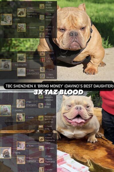 message jondon about this ad Hoobly friends here we have an exclusive litter of quality nano/micro exotic bully pups with limited availability. TBC SHENZHEN X BRING MONEY, this special litter is BRED to PRODUCE with sire and dam complimenting each other down to every detail. The puppies are very consistent, strong, healthy, agile and every single pup is of high calibre. All these great features will carry on in their genes and future production topped with a HIGH POWERED PED consisting of TAZMANIAN DEVIL, BAPE, VENENO, DAVINCI EURO EARL all upfront! The best imported bloodlines from china available in NORTH AMERICA! This specific breeding is very limited, rare and sought after in terms of quality bloodlines and history. If you want the advantage of acquiring top quality exotic with the best bloodlines without having to worry about importing stress and health guarantees. PM for more details, these pups are not cheap! Our kennel is based in Canada and have many references by top breeders worldwide. message jondon about this ad |