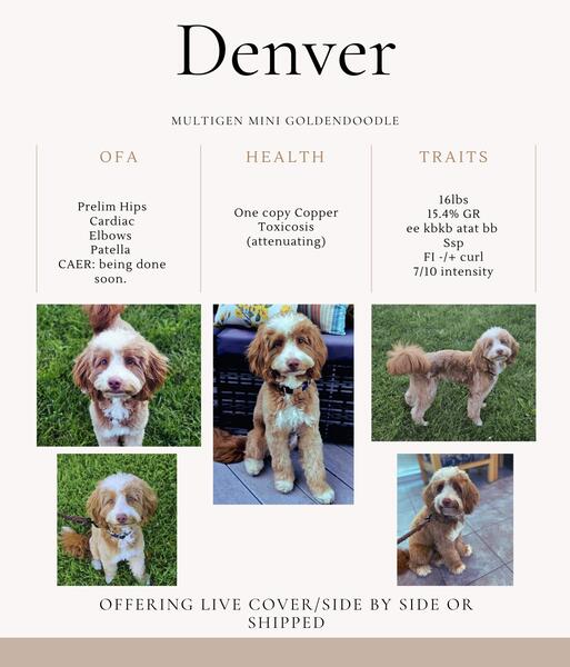 message frenchcreekdoodles about this ad Denver is a darling little Micro Mini Goldendoodle available for stud. This fella is handsome, charming and has the most endearing personality! He is genetic health tested as well as had his OFA prelim heart, patella, cardiac and hips done. Located in Platteville Wisconsin but can ship overnight and also willing to travel to meet. |