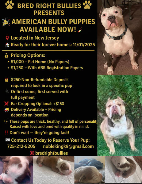 message bredrightbullies03 about this ad BRED RIGHT BULLIES PRESENTS AMERICAN BULLY PUPPIES AVAILABLE NOW! Located in New Jersey Ready for their forever homes: 11/01/2025 Pricing Options: $1,000 Pet Home (No Papers) $1,250 With ABR Registration Papers $250 Non-Refundable Deposit required to lock in a specific pup Or first come, first served with full payment Ear Cropping Optional: 150 Delivery Available Pricing depends on location Each Puppy Comes With: First Round of Vaccines Dewormed Puppy Info Packet (everything you need to know You can contact me at noblekingk9@gmail.com / 7two5-two12-five2zero5 |