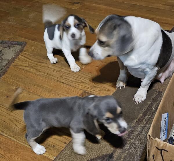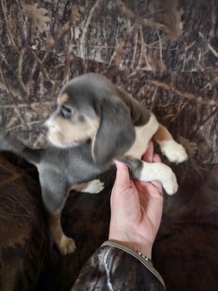 message rebelstar about this ad Only one female left! The one with more white on her. Born 9/26/2025. Extremely rare blue Beagle puppies that are AKC registered. They are current on vaccines and dewormed. Both parents are on site. Mom is a tiny 11" and weighs 16 pounds. Dad is 13" and weighs 28 pounds. Puppies are played with daily and very social. They love other dogs and are very playful. Located near Lagrange, IN but can be shipped/ transported at your expense. Call or text at 260-367-one zero 8 five. |