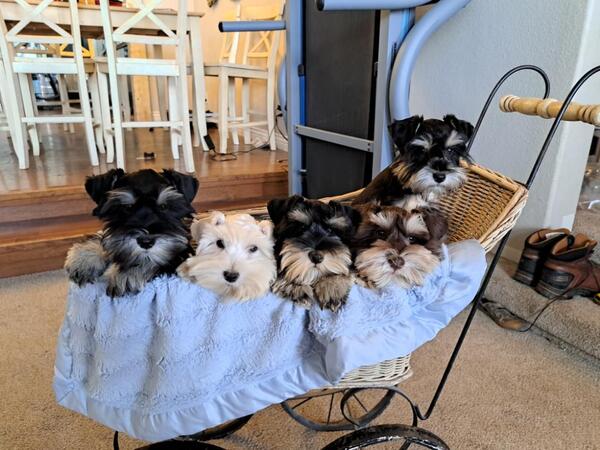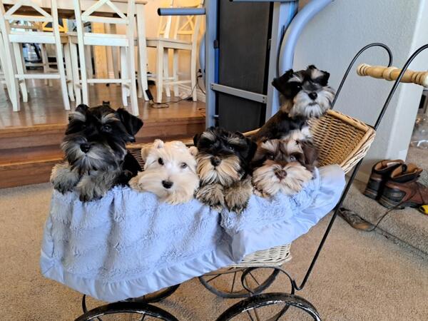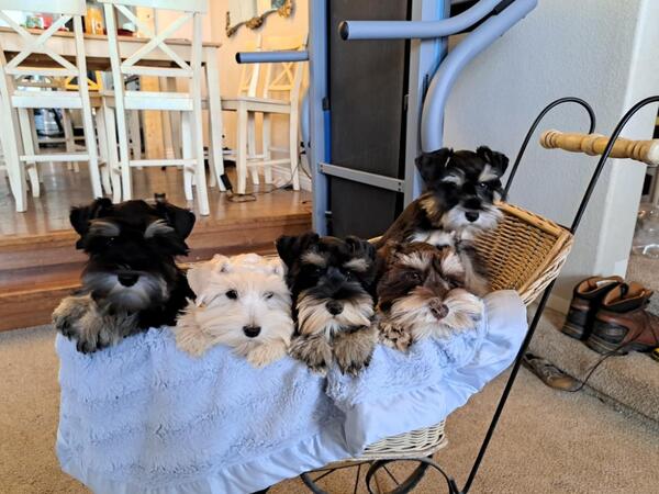 message akcpups about this ad Sweete Purebred AKC registered, I have THE prettiest puppies! GREAT temperament and disposition. Our pets are raised in our home with tons of love by us, our kids and our grandkids. They are a huge part of our family. Your new best friend will come with her tail docked, dew claws removed and have a schnauzer cut, and will be utd on puppy shots! SUPER MEGA coats! etc We have had Liver pepper and chocolate, chocolate and tan, Black, Black and Silver, Salt and pepper. Currently available puppies are black and silvers, chocolate & tan and white! These ones are $2200+ Males and females. New puppies are ready now 480-3 58 4505 One girl is going to be a tiny teacup We are in E Queen Creek, Az Origin: Germany Temperament: Spirited, Alert, Obedient, Friendly, Fearless, Intelligent I do not work outside the home and spend most all of my time with my kids and animals. They will be well socialized with male and female adults, kids, other dogs and held often. We have a smoke free animal loving home! I do not allow anyone to touch the puppies until they are 6 weeks old with their first shots. This is to protect the puppies health! I can however send pictures, plus at around 6 weeks You can come out and play with them. (However Your are welcome to come meet my adult dogs to get a feel for size and temperament) Our Beautiful puppies come with age appropriate vaccines, vitamins, dew claws removed, tail docked, first hair cut, De-Worming. *AKC pet paperwork, solid food and started on kennel training and a starter package and maybe a little pre- spoiled. They all have very nice genetically sound lineages. All puppies are sold as family pet companions. *Show proof of spay/neuter message akcpups about this ad |