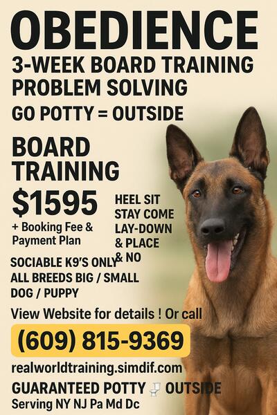 message lnljgm5332 about this ad REAL WORLD DOG TRAINING NYC Transform your dog in just 21 days! 21-Day Board & Train $1,595 Obedience: Heel Sit Stay Come Lay-Down Place No Guaranteed Potty Training (Outside) Problem Solving: Barking, Chewing, Jumping, Whining Daily WhatsApp Updates Sociable dogs only, vaccinations required NOVEMBER SPECIAL 2 DOGS TRAINED TOGETHER $2,095 Both K9s must enroll together & pass evaluation Full 21-Day Board & Train, same skills as above Call or Text: 609-815-9369 Serving NYC NJ PA MD DC N. VA Professional Trusted Guaranteed Big or Small, We Train Them All! |