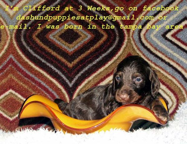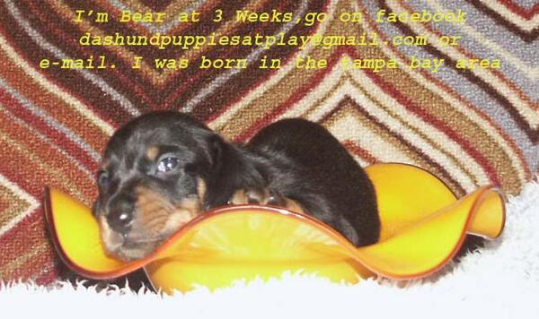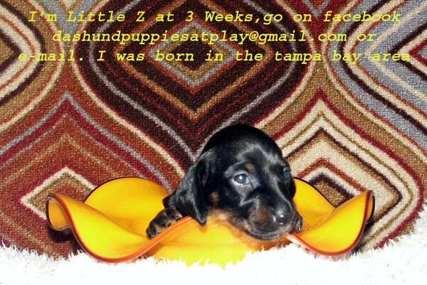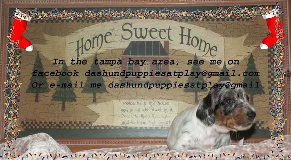 message buster4622 about this ad A verity of tri-colored puppies. must leave a message 727 232 0446 or facebook, email dashundpuppiesatplay@yahoo.com |