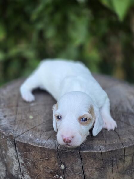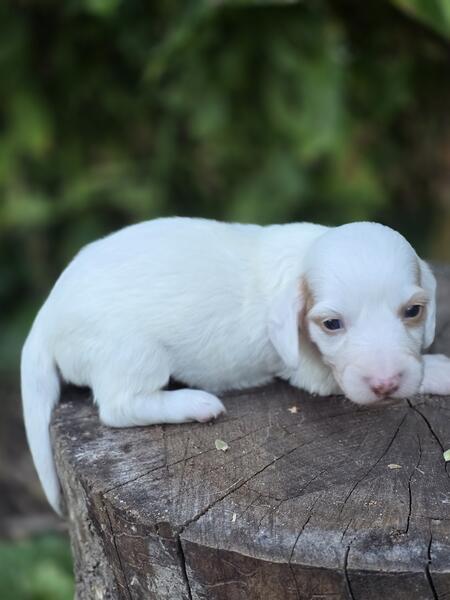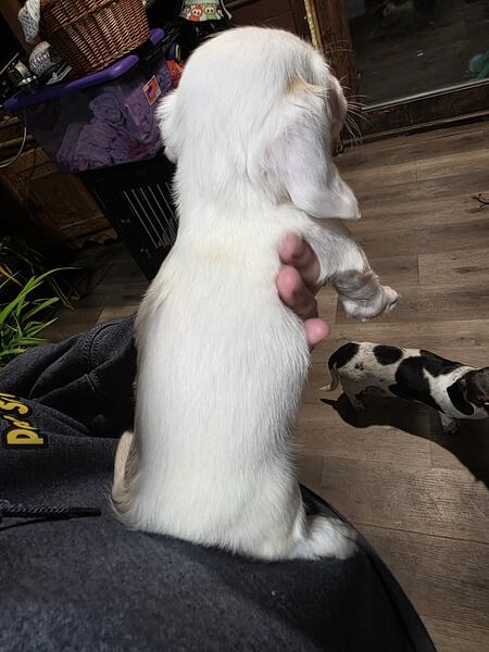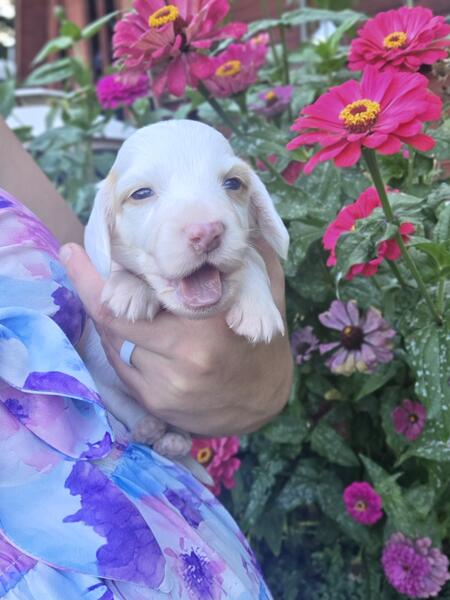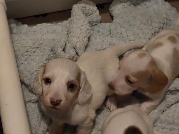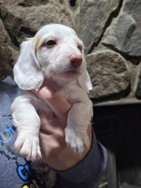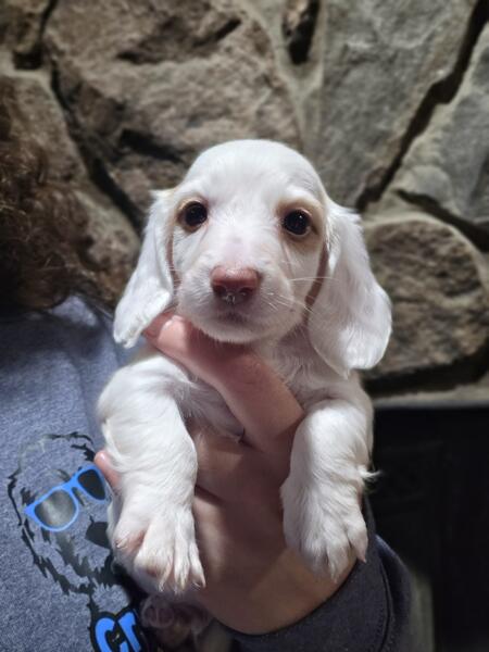 message crysti about this ad Long hair mini dachshund male. Cream and white piebald. Pups will be raised in my home with children and other pets! Started on training and I will send frequent updates. Ready in Novemeber 8th! Will be vetted including physical exam, shots and deworming. Both parents have been health tested and are genetically clear. Both parents have phenomenal temperaments and are extremely laid back and excellent with children. Each pup also comes with a lifetime discount on groom and board at my shop here in Otsiville, michigan. I do allow meet and greets after vaccaintions at 6 weeks old |
