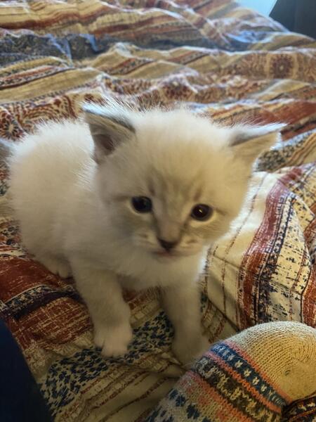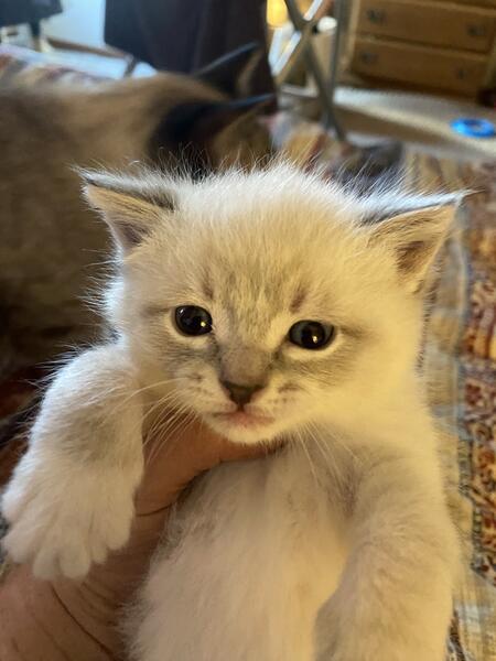 message coleod about this ad Ragamese Snowshoe (Rag Doll & Siamese Snowshoe) Kitten with 2 white front mittens and 2 long socks on back legs.Ready for a new home on April 12th. Just days before Easter!Reserve today.Looks to be a male, but too early to determine? Will have 2 shots and be wormed before going to new home. Soft as bunny and will have medium to long coat. Very loving and playful! Spoiled rotten as I work from home400.00. |