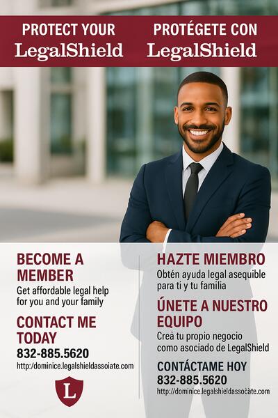 message dscrp215 about this ad ENGLISH SECTION (Left side) PROTECT YOUR LegalShield BECOME A MEMBER Get affordable legal help for you and your family CONTACT ME TODAY 832-885-5620 (Logo with letter L appears below) SPANISH SECTION (Right side) PROTGETE CON LegalShield HAZTE MIEMBRO Obtn ayuda legal asequible para ti y tu familia NETE A NUESTRO EQUIPO Crea tu propio negocio como asociado de LegalShield CONTCTAME HOY 832-885-5620 |