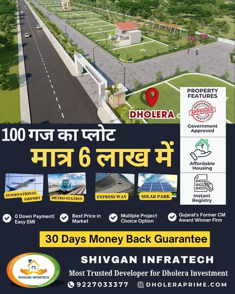 message dholeraprime about this ad Government Approved Plots in Dholera Smart City 100 Sq.Yard Plot in Just 6 Lakh Government Approved Property Near International Airport, Metro & Expressway Solar Park | Affordable Housing | Instant Registry 0 Down Payment | Easy EMI Options Best Price in Market | Multiple Project Choices Shivgan Infratech presents property investment opportunities at Dholera Smart City. One of the finest residential amenities in the future metro city of Gujarat. It facilitates with supreme lifestyle and abundant amenities amidst the beauty of nature. Award-Winning Developer Shivgan Infratech Prime Location + Best Price = High Resale Value Call Now: 9227033377 Visit: httpswww.dholeraprime.com |