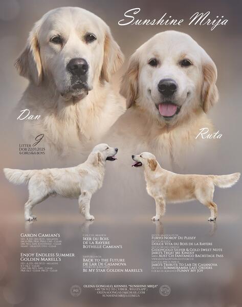 message sunshinemrija2025 about this ad Girl - puppy - golden retriever with an excellent pedigree. Clean from parents for diseases of golden retrievers, transmitted genetically, namely PRA1, PRA2, prcd-PRA, ICHTHYOSIS, DM. Parents and grandparents have excellent tests for dysplasia. The pedigree is full of champions of many countries, Interchampions, and a European champion. The girl will be ready to move to your home after May 31, 2025. Our Kennel is from Ukraine, now we live and work in Poland. The price of the puppy includes the cost of delivery to the Toronto airport. Documents of the Ukrainian kennel Union (FCI international veterinary passport, vaccinations, antihelminthic treatments and treatments against ticks according to age. We are always in touch - consultations on nutrition, education and proper raising of a real friend and family member. You can always see our dogs and puppies online - Sunshine Mrija kennel on Facebook, Instagram, TikTok and YouTube message sunshinemrija2025 about this ad |