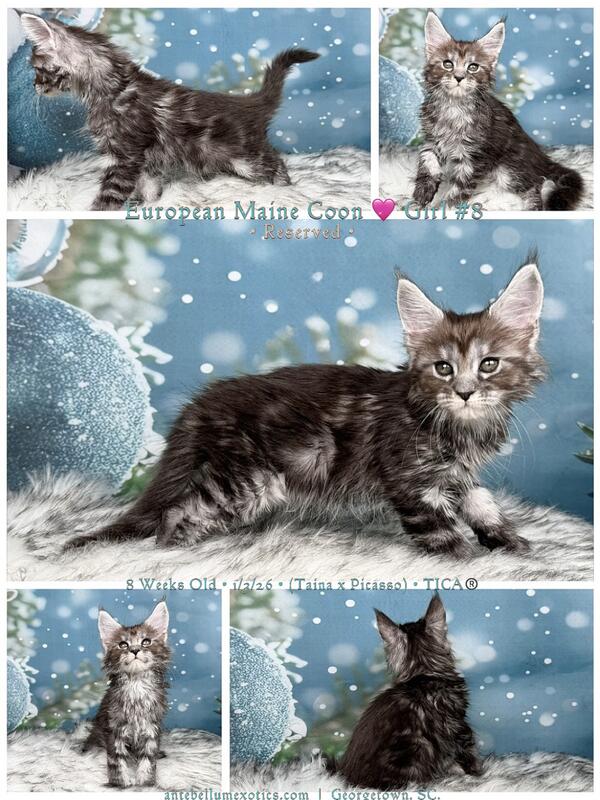 message antebellumexotics about this ad European Maine Coon Girl #8 - TICA (L Pablo Picasso x Taina) Coat: Black Smoke / White Nose: Black 8 Weeks Old: 1/3/26 Date of Birth: 11/8/2025 Birth Time: 3:47 am Birth Weight: 133 g Now accepting reservations until she can go to her forever loving home. Please contact us directly to discuss her and adoption process. They will be ready for adventure after 12 weeks of age fully vetted with microchip, health guarantee, and lifetime breeder support. (See full list of what we include on our site) See her from birth to now on our website and find out more about this gorgeous breed and how they can be a part of your life. antebellumexotics.com | Georgetown, South Carolina |