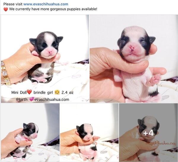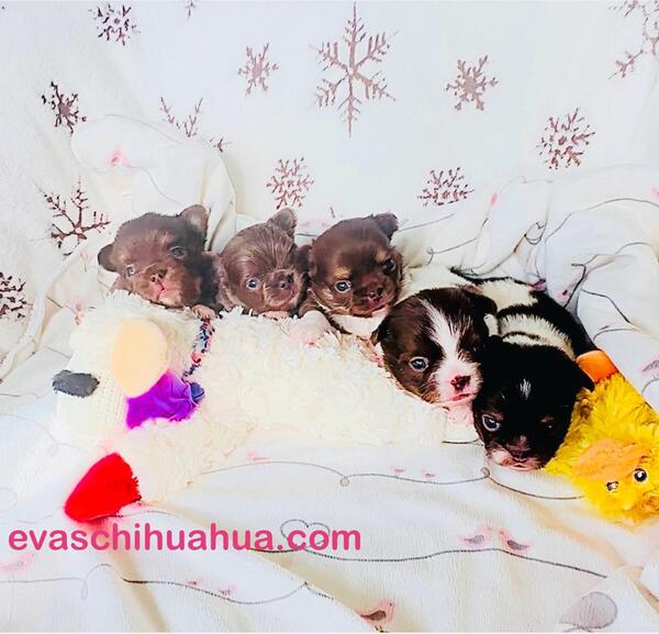 message evaschihuahua about this ad We currently have more gorgeous puppies available! Please visit - www.evaschihauhua.com for more details. Gorgeous Mini size chihuahua puppies Born at just 2.3 to 2.5 oz, they are estimated to mature at 3 to 4 lbs or less. with all the unique colors and markings, beautiful, large domed apple head, short nose, and a tiny, compact body. Those exceptional boys and girls are available only to a proven, lucky homes. The mothers are extremely sweet 4 to 4.5 lb girls. Her father is a mellow, sweet 2.8 to 3.5 lb AKC Champion and a 5-point major winnerdefeating other champions at a very young age. All puppies come with a health guarantee and are from AKC show-quality parents, who have been health-tested for generations. Each puppy is up to date on vaccinations, dewormed, and vet-checked before going to their new homes. All our puppies come from world-class, top-winning show dog pedigrees. |