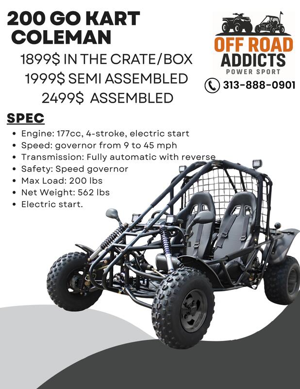 message karim about this ad Brand new 200 Coleman Go Kart I have a around 80 in stock and need to sell as soon as possible. In the crate for $1,899 Semi assemble easy to move for $1,999 Assembled and ready to drive for $2,499 (Comparable unit lists at Tractor Supply for $3699 I do offer deal if you buy in wholesale Just 6% sales tax for the stateNO other fees. I accept cash, Zelle, or card (4% fee Financing available with $70 down and 0% interest if paid off in the first 3 months. Comes with a title. Automatic CVT forward / neutral / reverse Front & rear hydraulic disc brakes Front adjustable independent dual shocks paired with rear adjustable dual shocks Harness seatbelts I also beat any other store prices. Check my page to see other power-sport machines and my reviews. Welcome anytime just let me know in advance. 313-888-0901 Kareem No CODES AND NO SCAMMER |