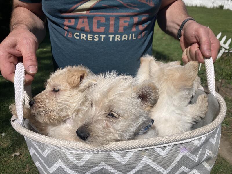 message carnescroftscotties about this ad Snuggly pups ready to come home to you. $1,800 pure bred Wheaten Scottish Terrier puppies, 12 weeks old. 1 boys and 2 girls available. Includes AKC registration, microchip and lifetime registration, vaccinations, 1 year health guarantee. Parents are DNA checked and clear for inherited disorders. Scotties are playful, sassy and smart. They are socialized to get along great with other dogs. Fenton, MI Lindsey 810-445-6780 cell/text |