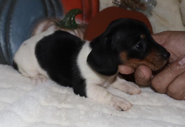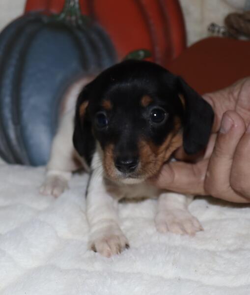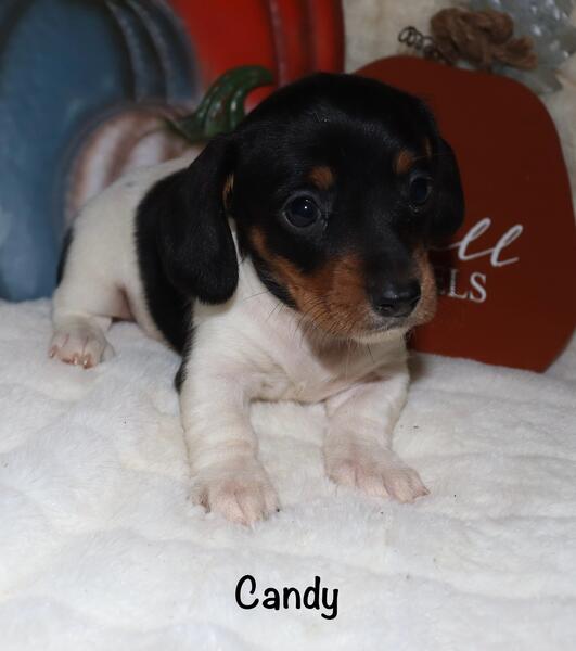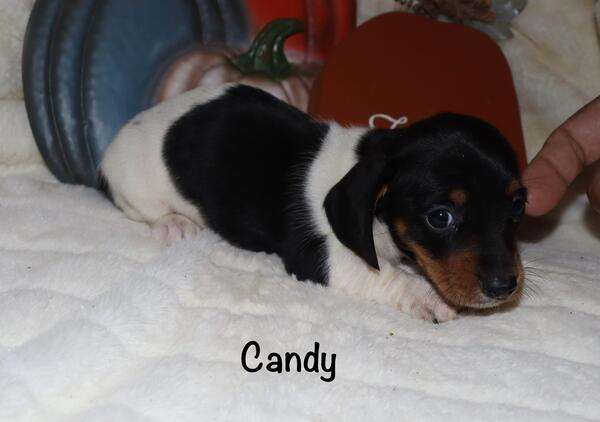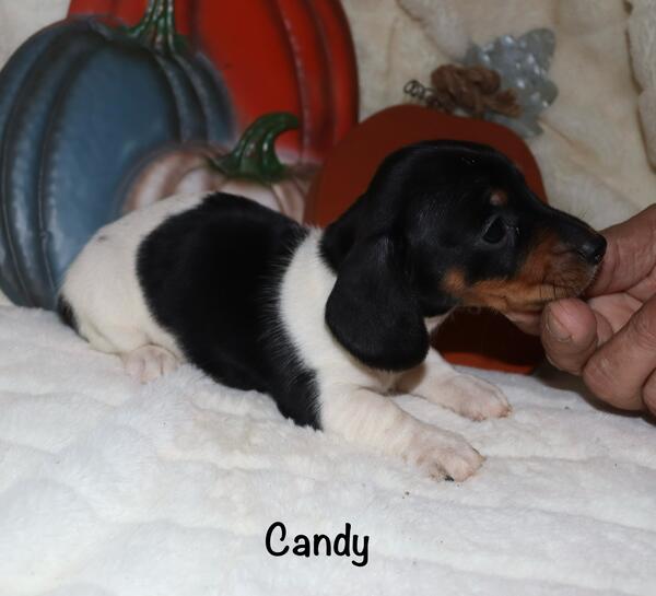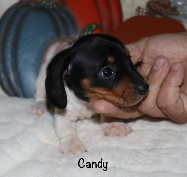message uttspoodles about this ad Candy is a female black and tan piebald miniature dachshund. Her parents are 9 and 11 lbs. she will be up on her shots and deworming when she leaves here. DOB is 9/25/25 |