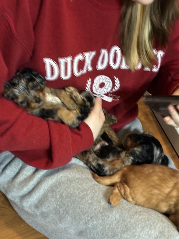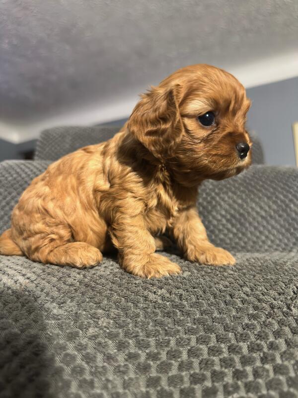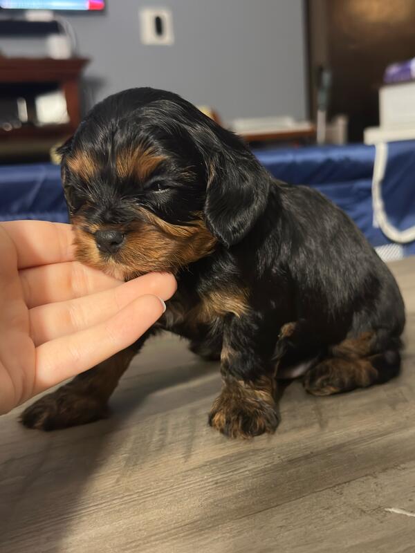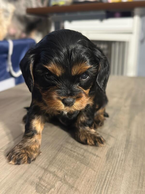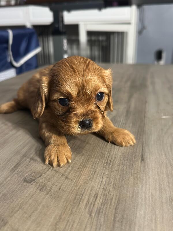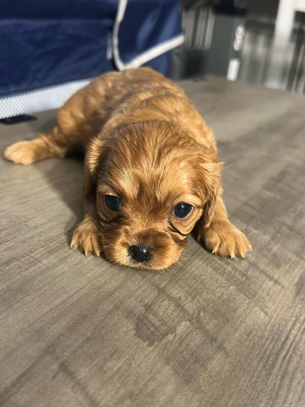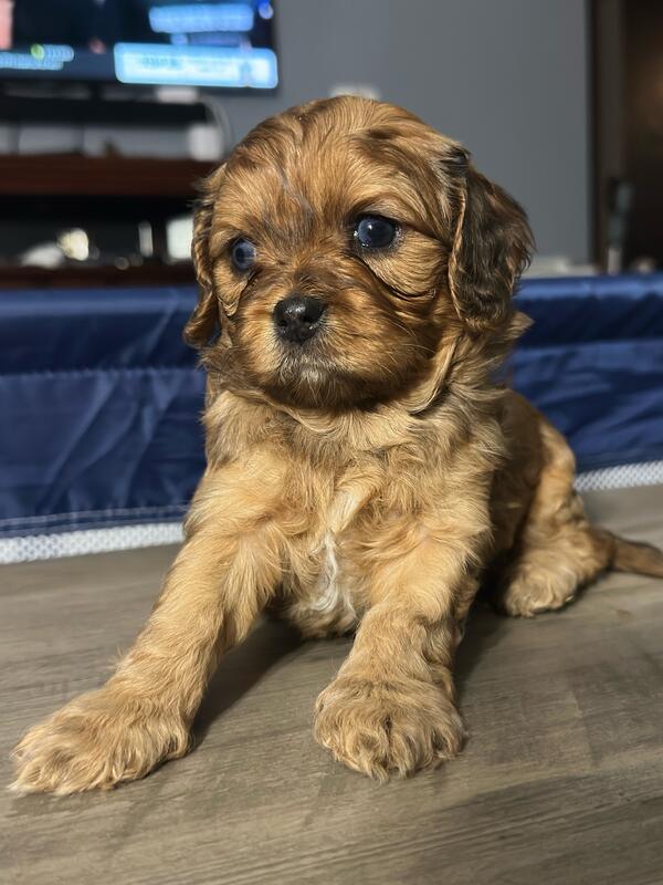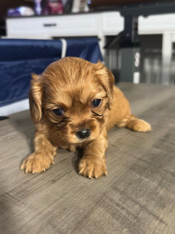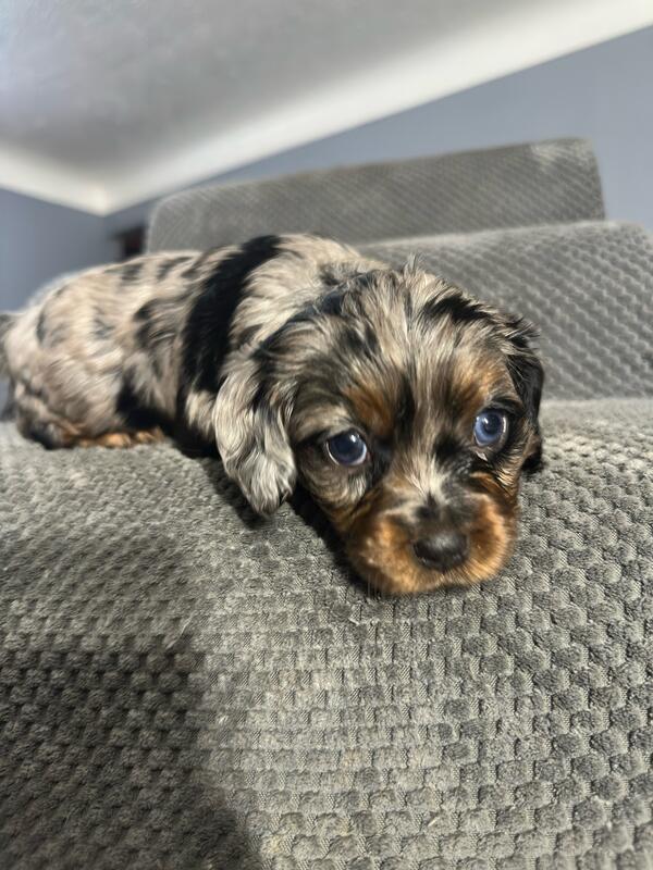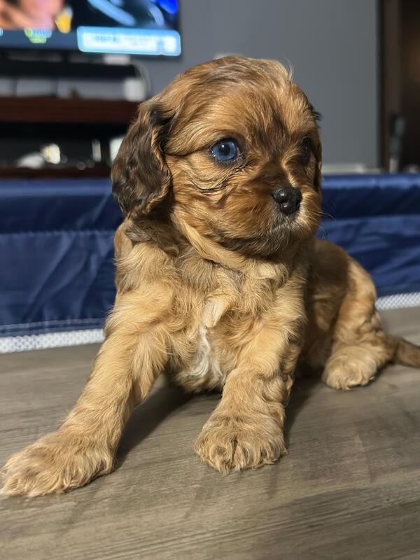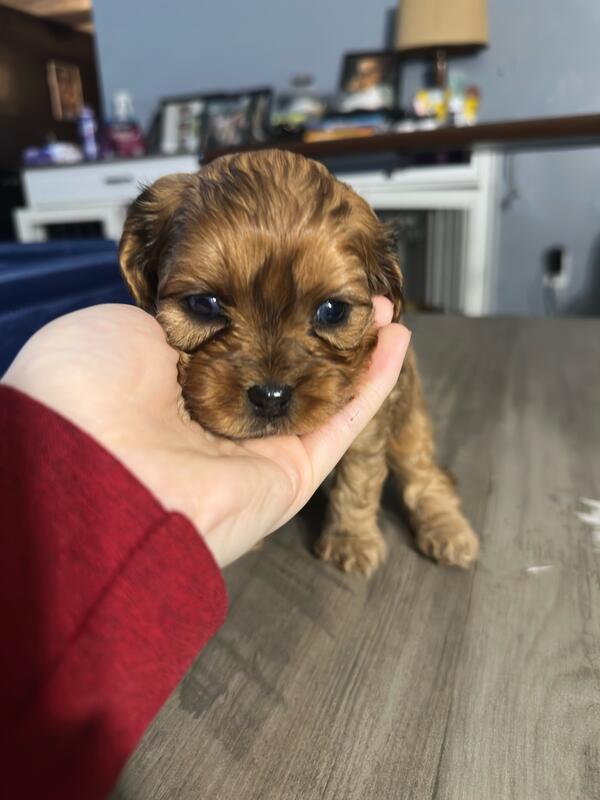 message frfgh6945 about this ad 5 weeks old. Born 10/19/25. 5 boys and 2 girls. The girls are both all brown. 2 boys have all blue eyes and a couple others have partial blue eyes. Mom and dad are both cavapoos weighing about 15 lbs. They are very playful and already starting to eat puppy food. |