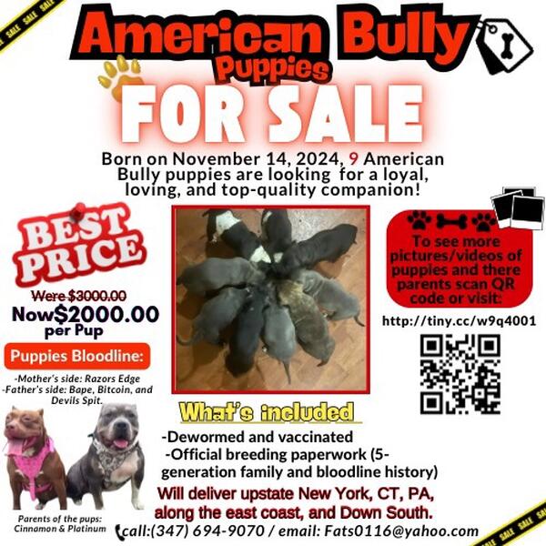 message ftshc211 about this ad 2 month old American Bully Puppies Looking for a forever home Puppies come with Ear Cropping Shots & Dewormer & paperwork showing 5 generations Father is Bape + DEVILSPIT + Bitcoin & Mother is Razors EdgeDelivery Available |