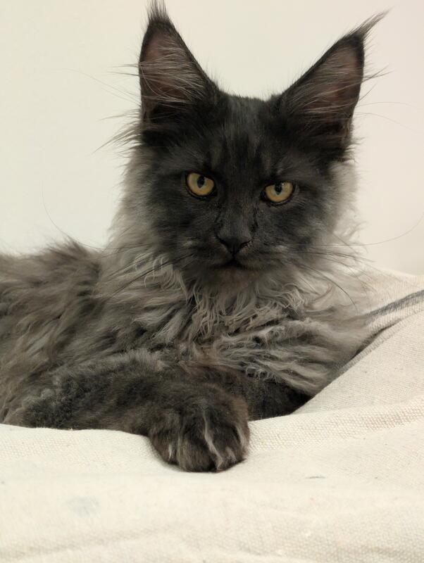 8 month old black smoke male maine coon kitten, neutered and with papers. He is super super sweet and very cuddly.