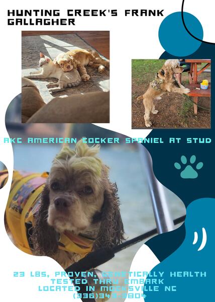 message huntingcreekk9s about this ad Frankie is our AKC Cocker Spaniel stud and he is the best boy. He is smart and eager to please, playful, and loving.He is Buff and white and has produced several healthy litters for our breeding program and others. He has been genetically health tested thru Embark. He is very smart and well trained and has a very social and sweet temperament stud fee is due at time of first tie or artificial . We try for 3 ties total over the course of a few day. A Stud contract is available for your protection. We have plenty of past references. For more or to inquire about stud services please call or text Adria at (336)343-3804. In house artificial insemination is available for larger females. |