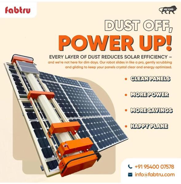 message fabtru about this ad Its not just sunlight that affects your solar plants performance cleanliness matters just as much. When dirt, dust, and debris coat your panels, you lose significant energy output. Thats not a minor detail its your bottom line. Fabtru Innovation Pvt. Ltd. gives solar operators a way to protect that bottom line with our Automatic Solar Panel Cleaning Machines. These devices are engineered to clean thoroughly, daily, and autonomously. That means no water, no chemicals, and no ongoing labor expenses just consistent, efficient power generation from panels that stay clean. Designed and built in Gurugram, our machines are field-tested across India from the dry zones of Gujarat to the industrial corridors of Delhi NCR. Theyre known for durability, ease of integration, and long-term reliability. By maintaining a clean panel surface, Fabtru helps you ensure your energy production is stable, predictable, and high yield. You get better returns, fewer maintenance calls, and a longer panel lifespan. If your solar project is built for profits, make sure it's cleaned for profits too. Go automatic. Go Fabtru. message fabtru about this ad |