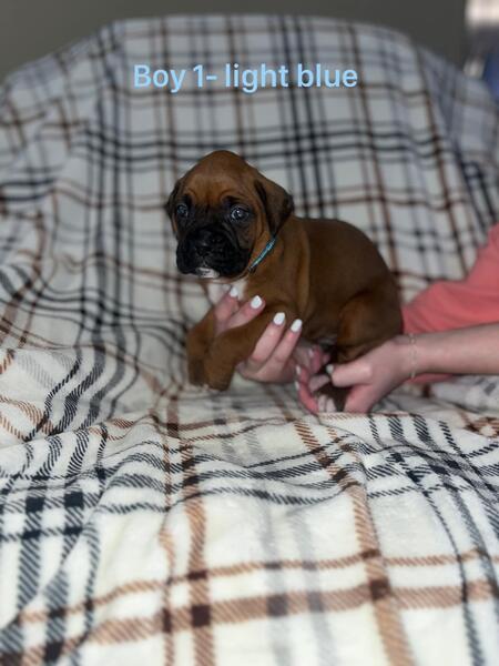 European males boxer, tail docked dew claws removed. Will have 1st set of shots