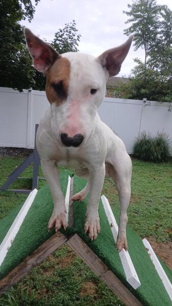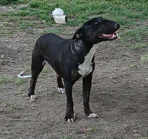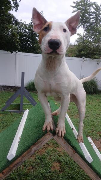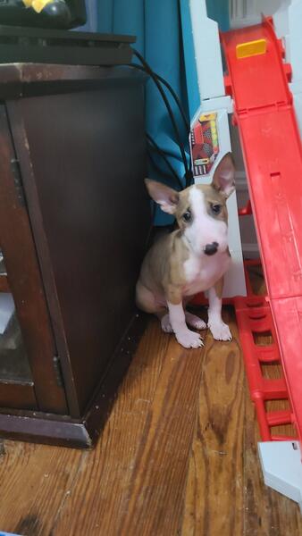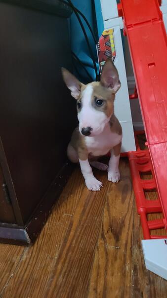 I have a tan and white female bull terrier pup, she is going on 3 month. She is not Akc reg, asking 600 obo