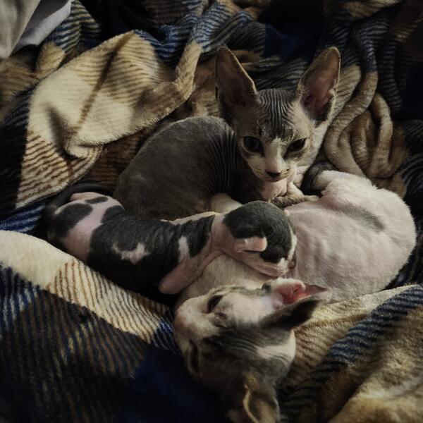 message squeakandbeau about this ad We have one with devon rex ear and peach fuzz hair will be ready October 12, 2025 will come with vet check Dad is elf ear sphynx white with blue markings more peach fuzz hair. Mom is devon rex gray and white wavy hair. Both are cuddle bugs Happy and healthy 1200. Obo |