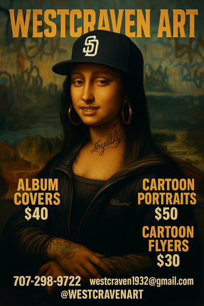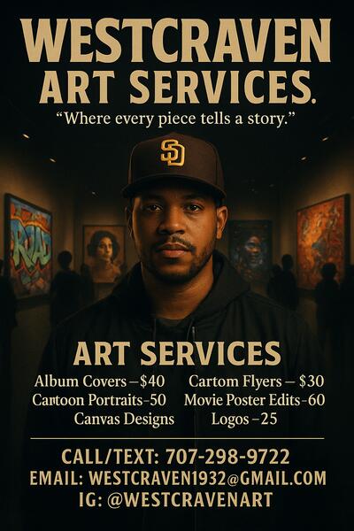 message gorillacoast about this ad Need Custom Art That Hits Different? Tap in with WestCraven Art Services where every piece tells a story. Whether youre a music artist, entrepreneur, or just someone who wants to stand out I got you. I specialize in bold, original, eye-catching art that turns heads and builds brands. Heres what I offer: Album Covers $40 Cartoon Portraits $50 Custom Flyers (Cartoon Style) $30 Movie Poster Edits / Canvas Designs / Logo Concepts Prices vary Bundle deals available. Just ask. Let me know what you need: Do you want your art realistic, cartoon-style, 3D, or movie-poster quality? Is it for digital or print? Do you have a color theme, concept, or reference photo? The more details, the better I can make your vision real. Contact: Text/Call: 707-298-9722 Email: westcraven1932@gmail.com IG: @WestCravenArt Payment Info: Cash App: $GorillaCoast |