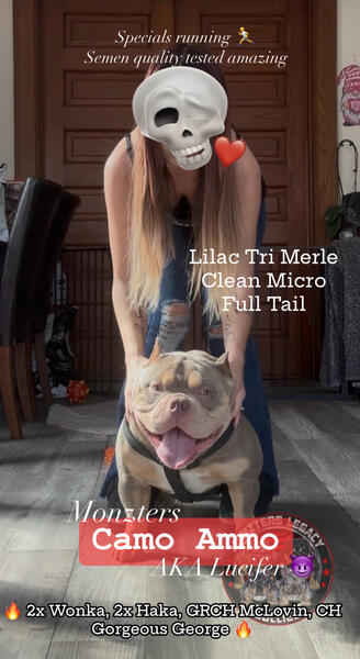 message thebullymom about this ad Looking for studs? Weve got you covered. Weve got tri color micro. quad carrier with heavy hitting ped. Pics attached. Text to inquire 7638982835. We also have tri Merle and solid Merle French bulldog studs open as well. All DNA tested and AKC registered. Stud fees range $1,000 - $1,500. Pup backs to approved females. Specials running on newer studs as well |