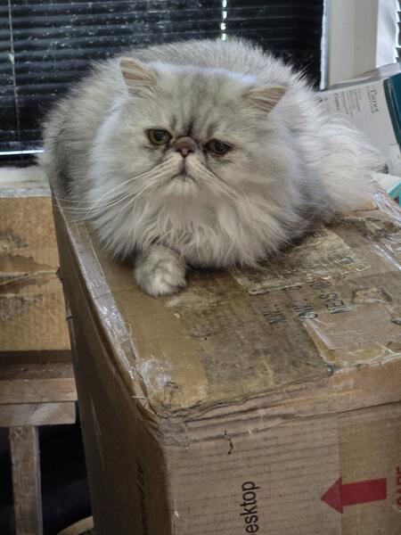 One year old Shaded Silver male, and a white with green eyes male Persian kittens.