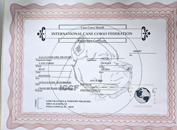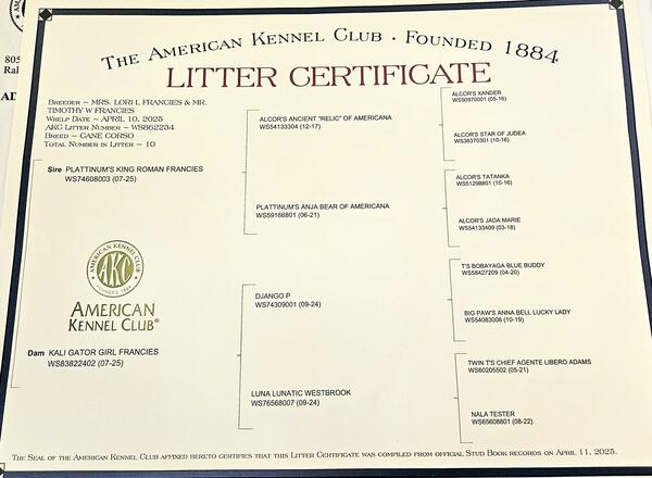 message canecorsomom about this ad Born on 04/10/2025 AKC AND ICCF REGISTERED LITTER 10 CANE CORSO PUPPIES WITH CHAMPIONSHIP BLOODLINES. WE HAVE 6 LEFT 3 FEMALES AND 3 MALES WAITING FOR THEIR FOREVER HOME. THEY ARE VACCINATED HEALTH CERTIFIED FOR 1 YEAR. SERIOUS INQUIRIES ONLY I am sending with this Puppies a puppy starter package as well. So if you really want an intelligent dog this is it! These Puppies are crate and house trained and currently working on outside training they are very very healthy and very smart already know a few commands. Again SERIOUS INQUIRIES ONLY |