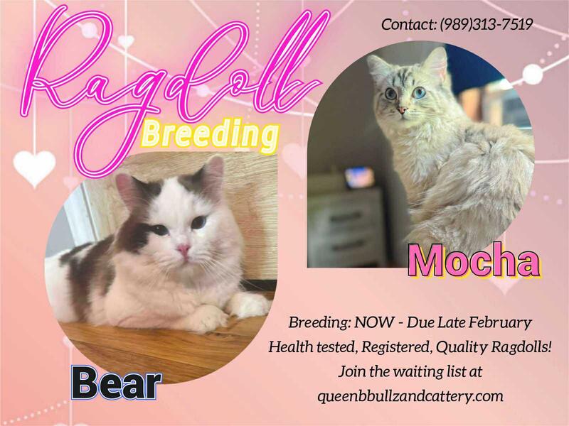 message queenbcatz about this ad Find us on Facebook: Queen B Catz Ragdoll Cattery Find us on Instagram: @queenb_catz_ragdollcattery Kittens: * PET HOME PRICE IS 1500 * Vaccinated & Microchipped * Litter trained * Extremely well socialized & confident * DNA tested * TICA registered *Spayed/Neutered Parents: * TICA registered * Both parents are health tested/ DNA testing, HCM, PKD & PRA negative * Carefully selected breeding program while specializing in temperament, and conformation * Quality imported bloodline (Father) Kitten "care package" includes * Vaccinations & dewormer record * Microchip information * Folder w/ all contracts & information * 5 pound bag of food * Toys & blanket * LIFETIME BREEDER SUPPORT WWW.QUEENBBULLZANDCATTERY.COM 989 313 7519 For all information and inquiries *Talk to me about trades |