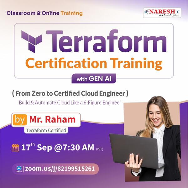 message jnit about this ad Become a Certified Cloud Engineer with Terraform + Gen AI! Register now: httpsbit.ly/488RA30 Naresh i Technologies brings you Terraform Certification Training to help you build & automate cloud infrastructure like a pro. What youll gain: Hands-on Terraform projects Integration with Gen AI tools Cloud automation skills Certification-oriented training Trainer: Mr. Raham (Terraform Certified) Starts: 17th Sept 2025 | 7:30 AM (IST) Mode : Classroom & Online Training Zoom Link: zoom.us/j/82199515261 Classroom Location: httpsg.co/kgs/E7xTTW From Zero to Certified Cloud Engineer Future-proof your career with Terraform! For More Details: Visit: Call: +91-9000994007, 9000994008, 9121104164 | support@nareshit.com Join us on Telegram: httpst.me/nareshit Join us on WhatsApp: httpsbit.ly/48EtMCb #NareshIT #Terraform #Aws #Webdervices #TerraformTraining #CloudComputing #DevOps #MultiCloud #CloudEngineer #Microsoftazure #Automation #GenAI #TerraformCertification #ITTraining #CareerGrowth #FutureWithCloud #ITJobs2025 #Learning #Software #Projects #CareerWithNareshIT message jnit about this ad |