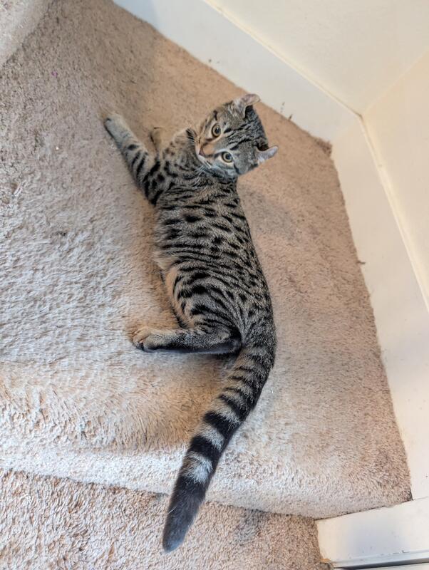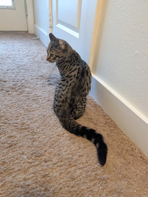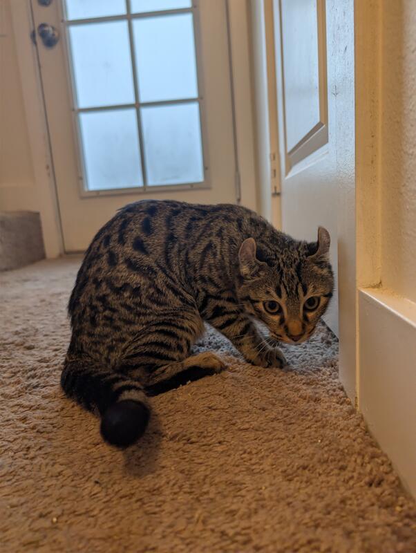 Male savannah/highland lynx kitten, F3. Very sweet and loves to purr. 6 months old