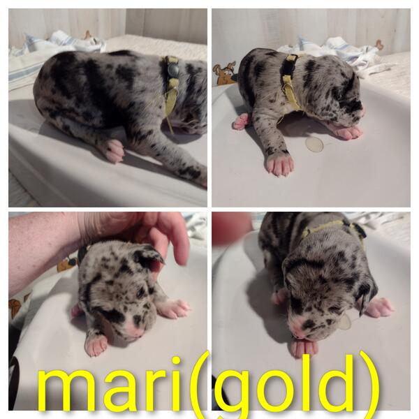 message loslocos2 about this ad Sweet little girl"Mari gold yellow collar, born 10/9/2025, will be ready to go home Dec. 04, 2025 Parents are pictured in photos. Mom, Charlee is a merle. The Dad, Kai is a blue. Parents are tested thru Embark. These lines have been healthy for me (no known, hip, heart or eye issues I own grandparents also. Will be dewormed every 2 wks. Since birth. First vaccines & vet check done at 6 weeks. Eating mush now at 4 weeks will be on solid food by 8 wks. Raised inside our home. Potty training started to litter box to help ease into potty training at new home. AKC. reg $1350.00. If do not want papers $1000.00. $150.00 deposit required to hold pup of your choice, rest due at pickup. Best to email me at loslocos at frontier dot com. Messages dont always get seen on here. OR if call LEAVE a message. |