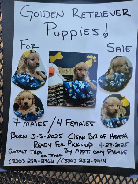 message theag about this ad Purebred 8 week old Golden Retriever Puppies for sale. First round of vaccinations administered on 4/26/25. Now's the time to add a bundle of cute puppy love to your family. Serious inquiries and cash only. Contact Thea @ 330.357.2966 for an appointment located in Stow, Ohio. Price is negotiable. |