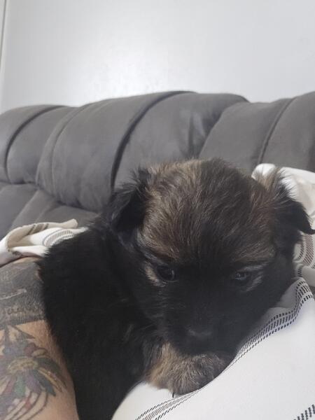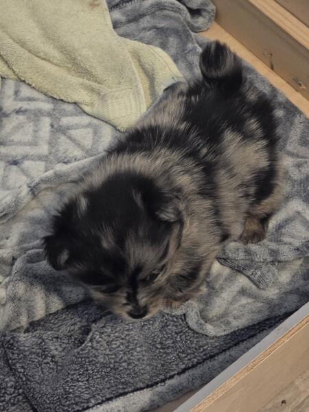message kipdeville0524 about this ad I have 3 pomchi puppies for sale 1 merle - black/Grey- female 1 Sable- black and brown - female 1 tuxedo with merle markings - male Will be ready December 8th with first rounds of shots. Please message me with any questions. Daddy is black and grey merle pomeranian Momma is solid black papillion with a little chihuahua. All are very sweet natured, curious, and playful. |