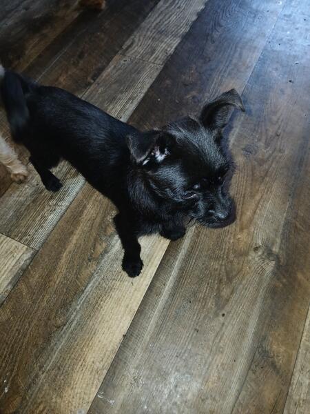 message joann92 about this ad This is dink he is uptodate on shots and wormings he is house trained good with other dogs love to play , paper pads in house or he gos outside hes has som pug in him looks like yorkie in size |