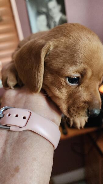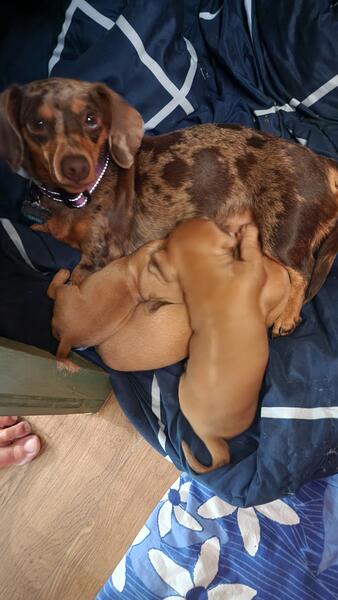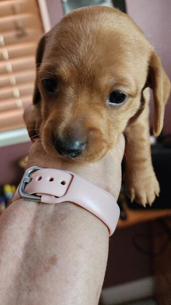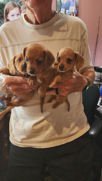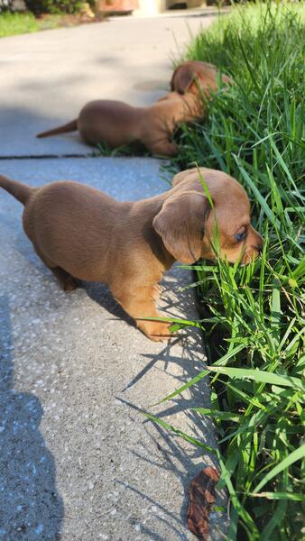 message ebysessions about this ad Three red male AKC miniature dachshund puppies. 7 weeks old, playful and adorable. Health certificate and 1st vaccines July 8th, then they will be ready to rehome. Dame-10lbs. Sire-11lbs. |