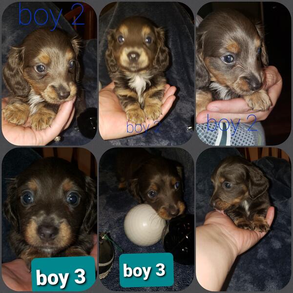 message jssnnt5096 about this ad Two mini dachshunds males they will be ready to go December 7th up to date on shots and dewormed can travel if needed |