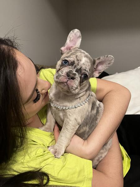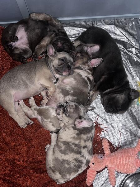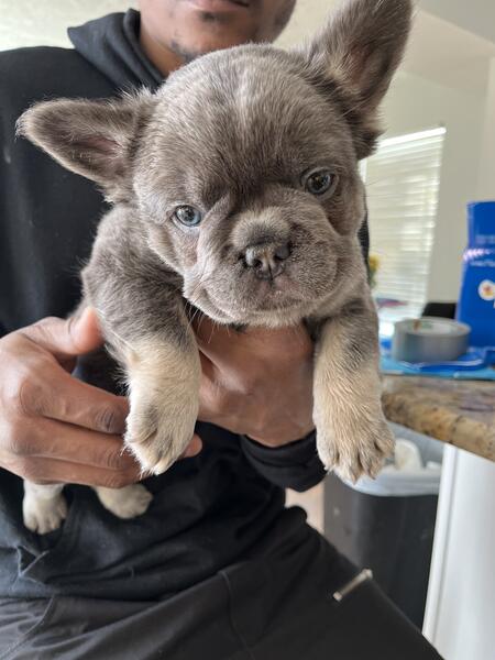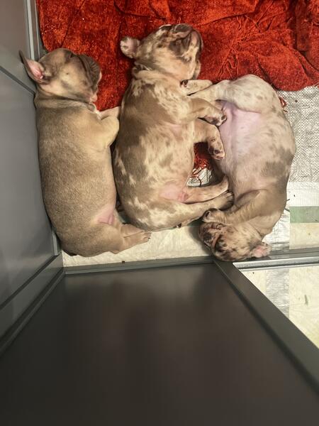 message nanafrenchies about this ad We have four frenchies AKC registered, up-to-date shots/ dewormed! 2 females & 2 males All litter trained/ puppy pad trained. Their mom is a blue fawn & dad is a blue Merle. Reach out for specific info & prices. |