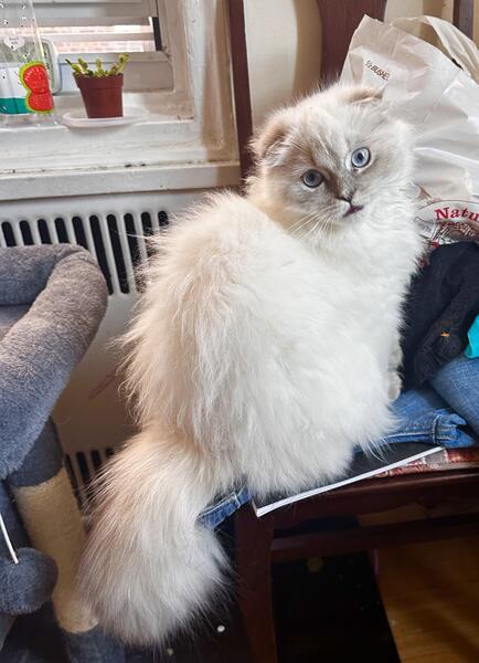 message nika2025 about this ad Short lambkin/ munchkin cross female, seal point white with big blue eyes is looking for a forever, loving home. She had first shorts and deworming - due for second round this month if possible. Not spayed as she is too young. Good with dogs. I got her from the breeder but unfortunately my daughter has bad allergy to cats and as she is a singer it affects her too much. We are not able to keep her. |