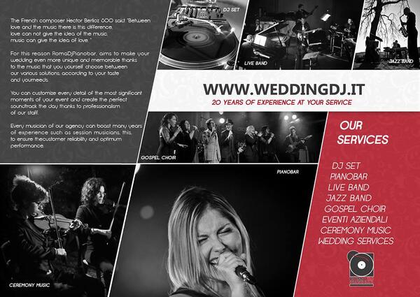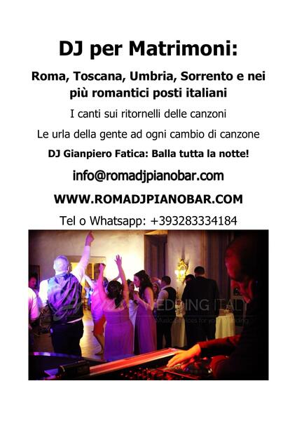 message weddingdjitaly about this ad Do you have to organize the fun, the dance with your favorite music in Italy for your wedding event? Options and solutions Dj set live, with Saxophonist or with vocalist or with jazz group for cocktail Estimates without obligation Write us on info@romadjpianobar.com weddingdj.it |