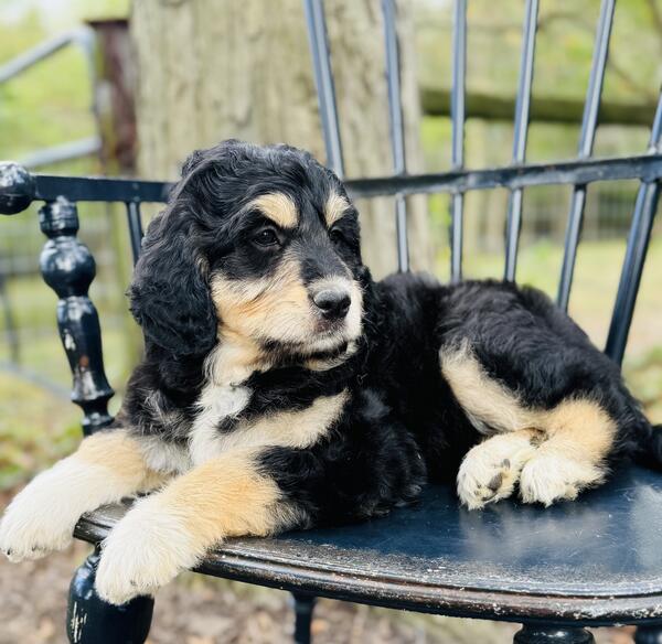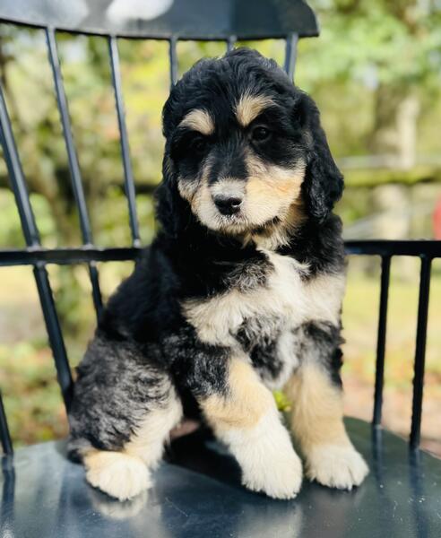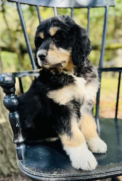 message tlimes about this ad F1 Standard Pyredoodle female. This girl is a unique and beautiful tricolor. She is so kind, sweet and gentle. She will make a wonderful companion or family dog. She will be approx 70 lbs. Health tested parents, wormed biweekly, vet checked, first vac and warranty. |