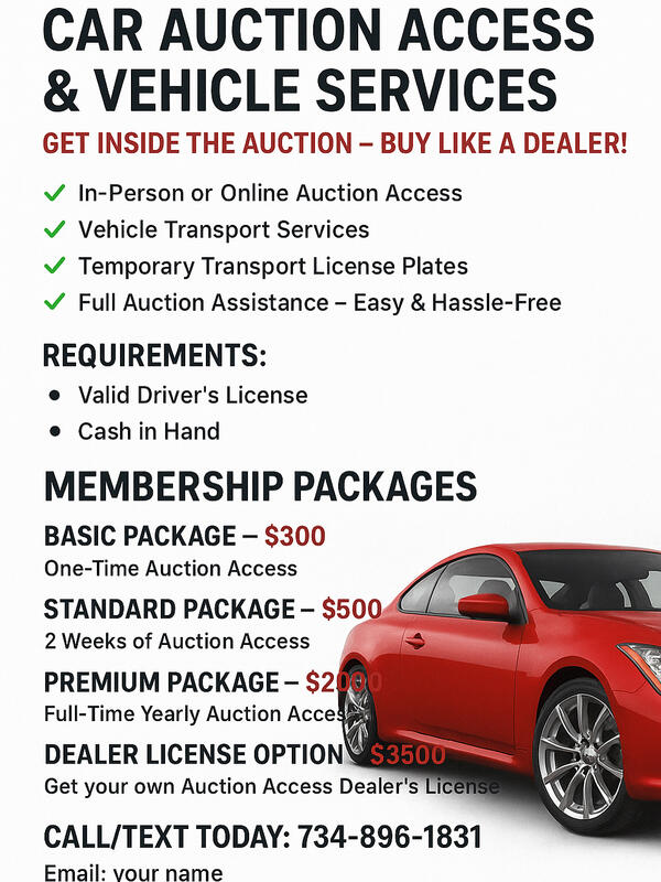 message bullycamp about this ad Read the flyer for the dealer auction access details. I am a Connecticut, Michigan license auto insurance agent. Can provide basic coverage within 10 minutes with no monthly payments for $150 or six months and $250 for twelve months. Hi service Connecticut & Michigan. |